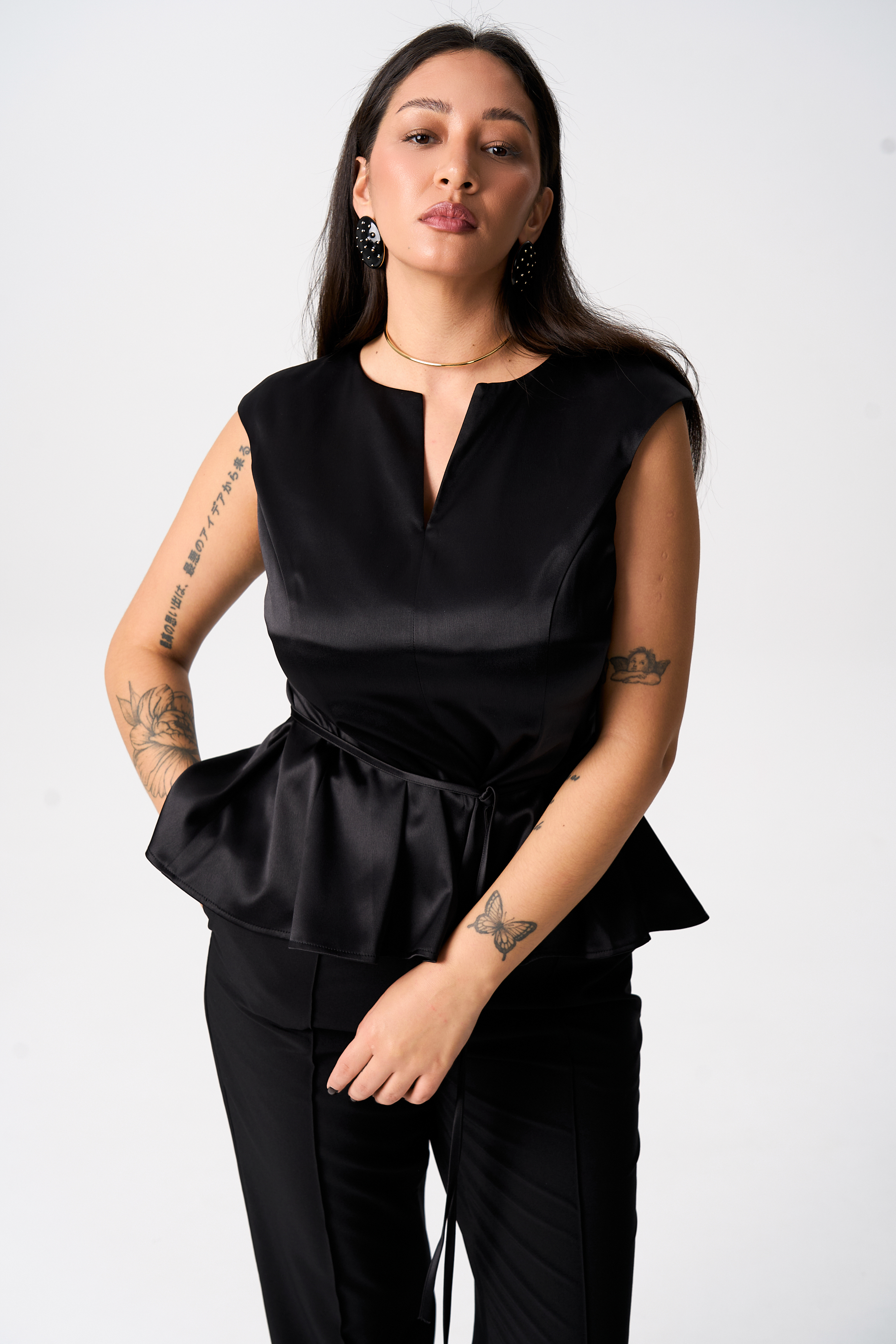 Модель полуприлегающего силуэта. По переду рельефы,переходящие в баску Горловина с V-вырезом. Рукав слегка спущенный. В комплекте тонкий пояс из основного материала.
