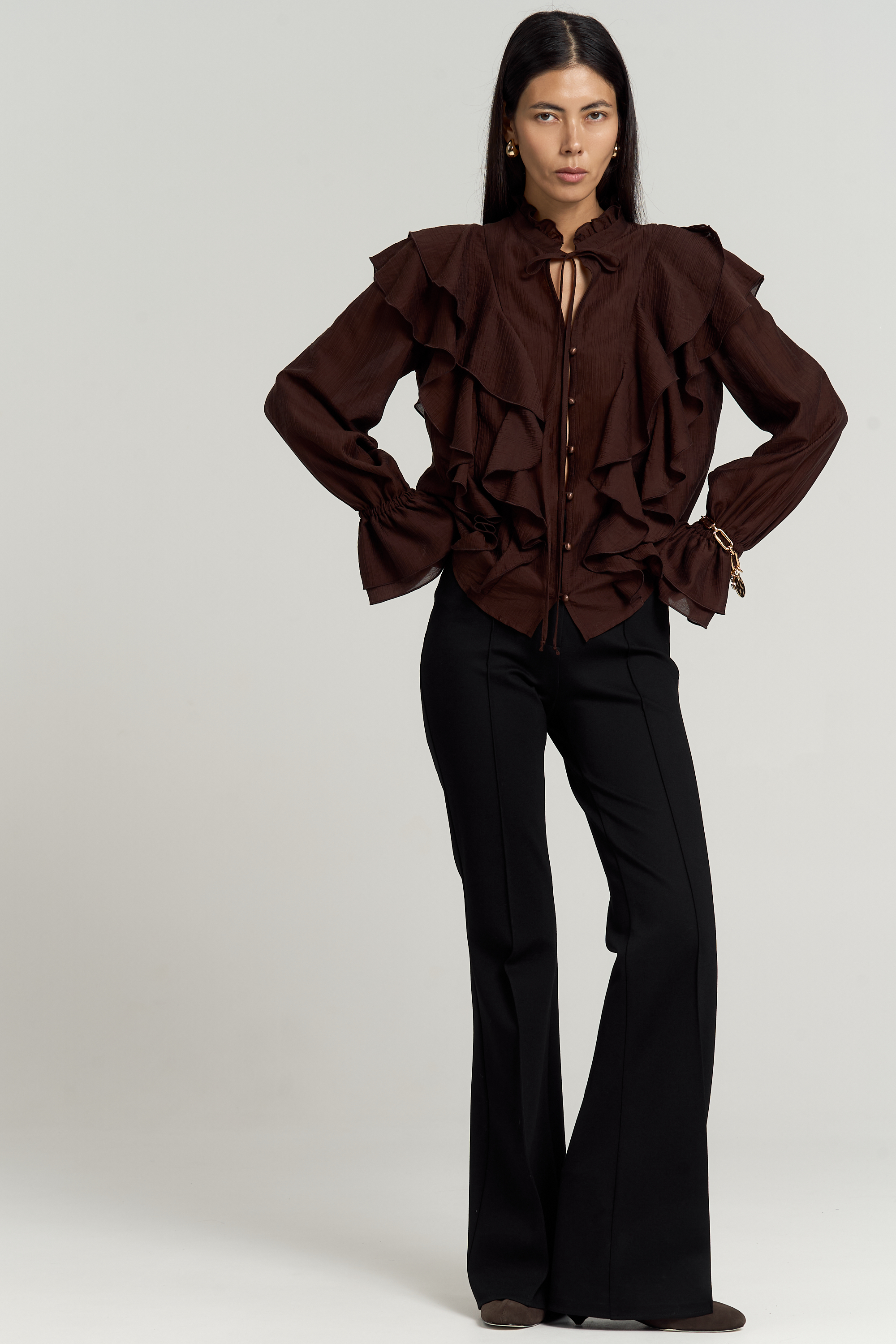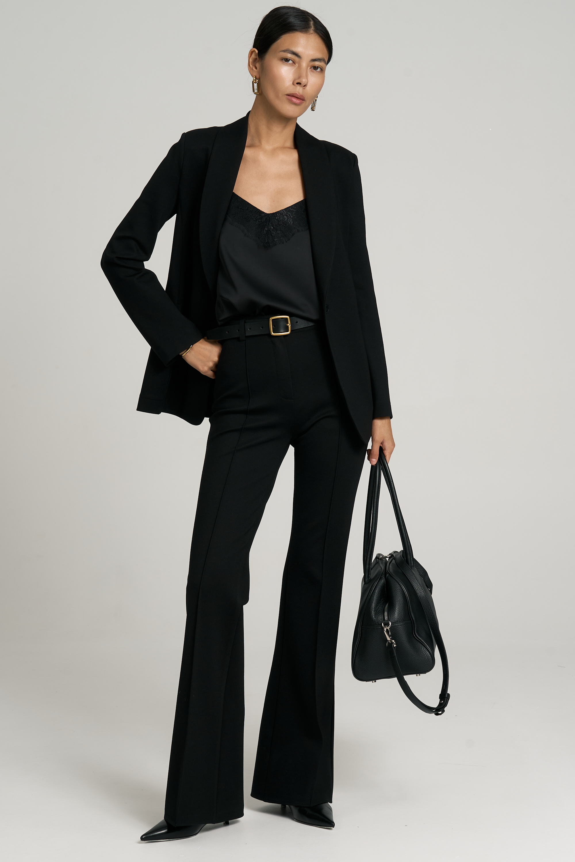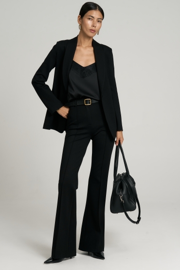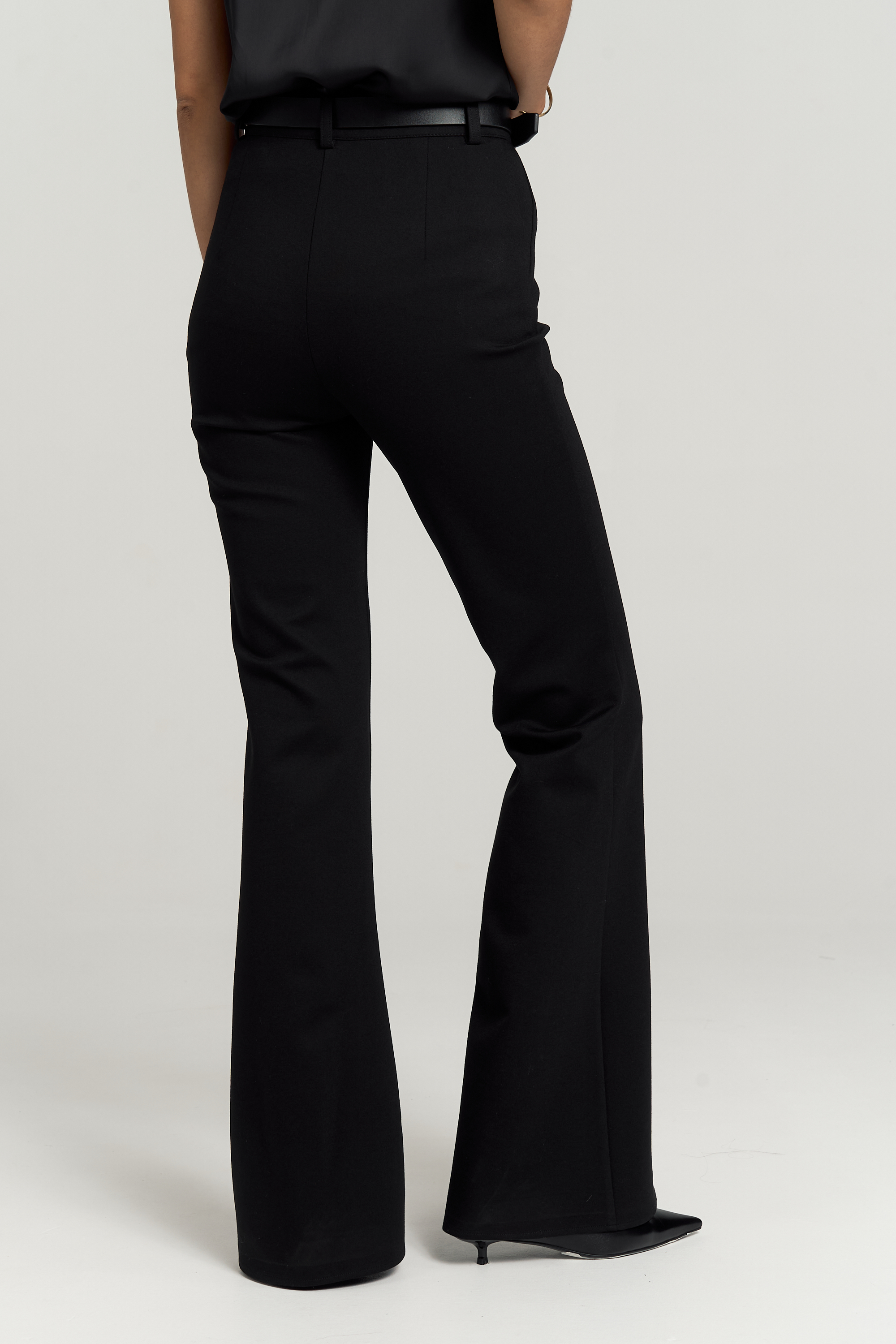 Модель прилегающего силуэта, расклешенного кроя. Высокая посадка. По переду застроченные стрелки, имитация боковых карманов.