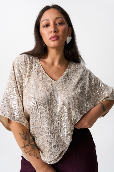 Модель свободного силуэта. Горловина обработана V-вырезом с кантом из трикотажной сетки. Рукав “летучая мышь”. Изделие на трикотажном