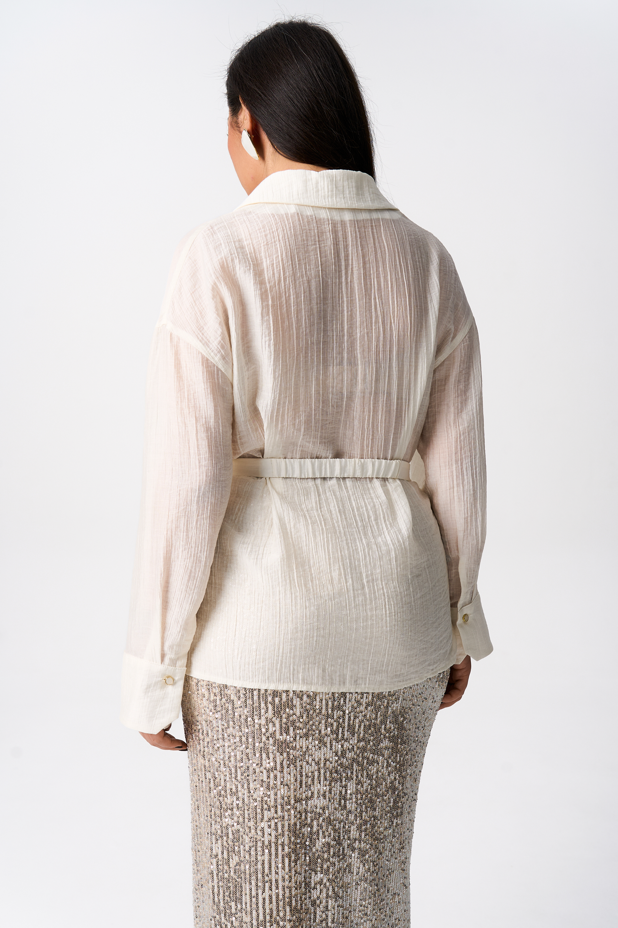 Модель свободного силуэта. Рукав спущенный плечом и фигурной манжетой на петлю и пуговицу. В комплекте пояс с двумя пряжками-застежками и резинкой по спинке.