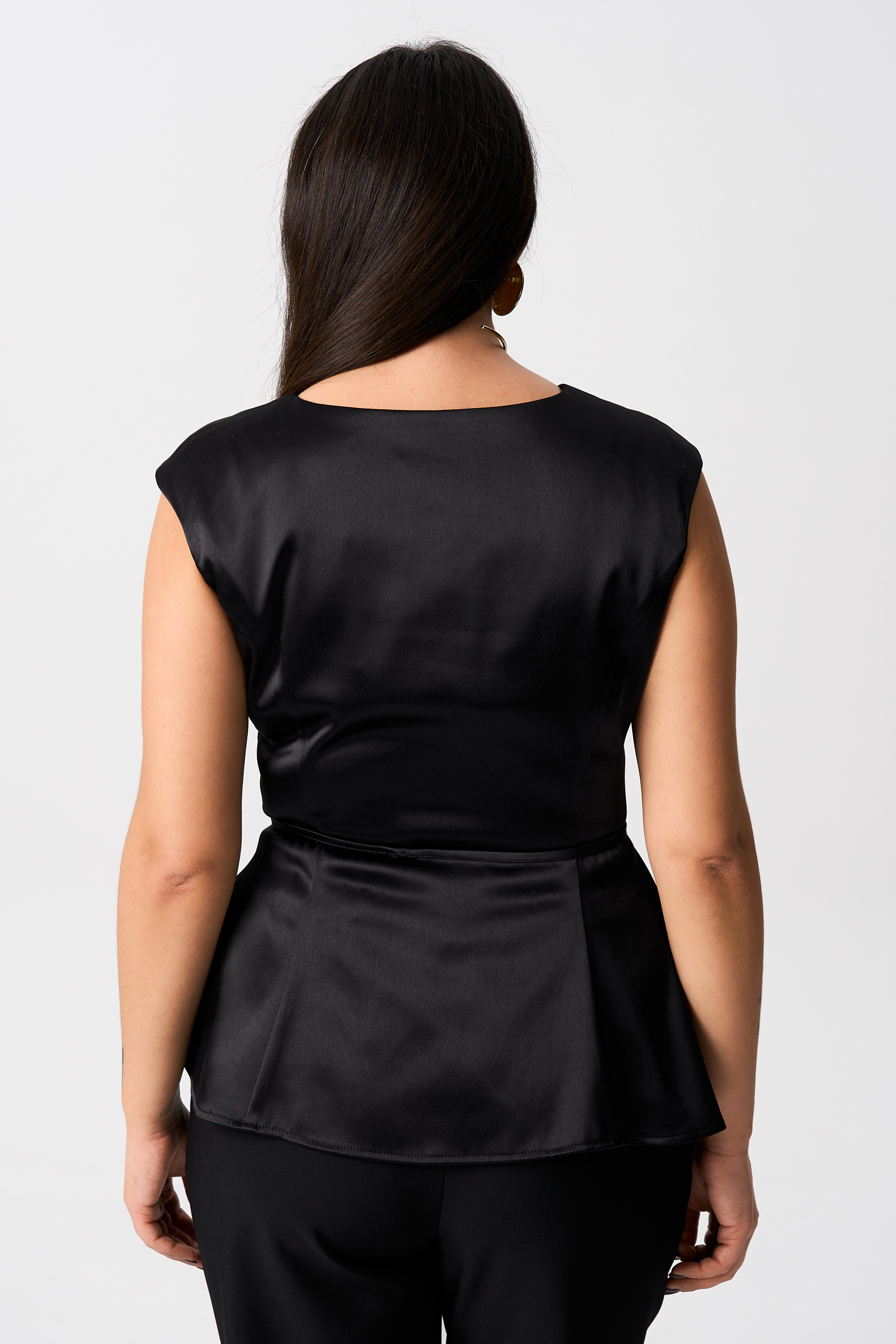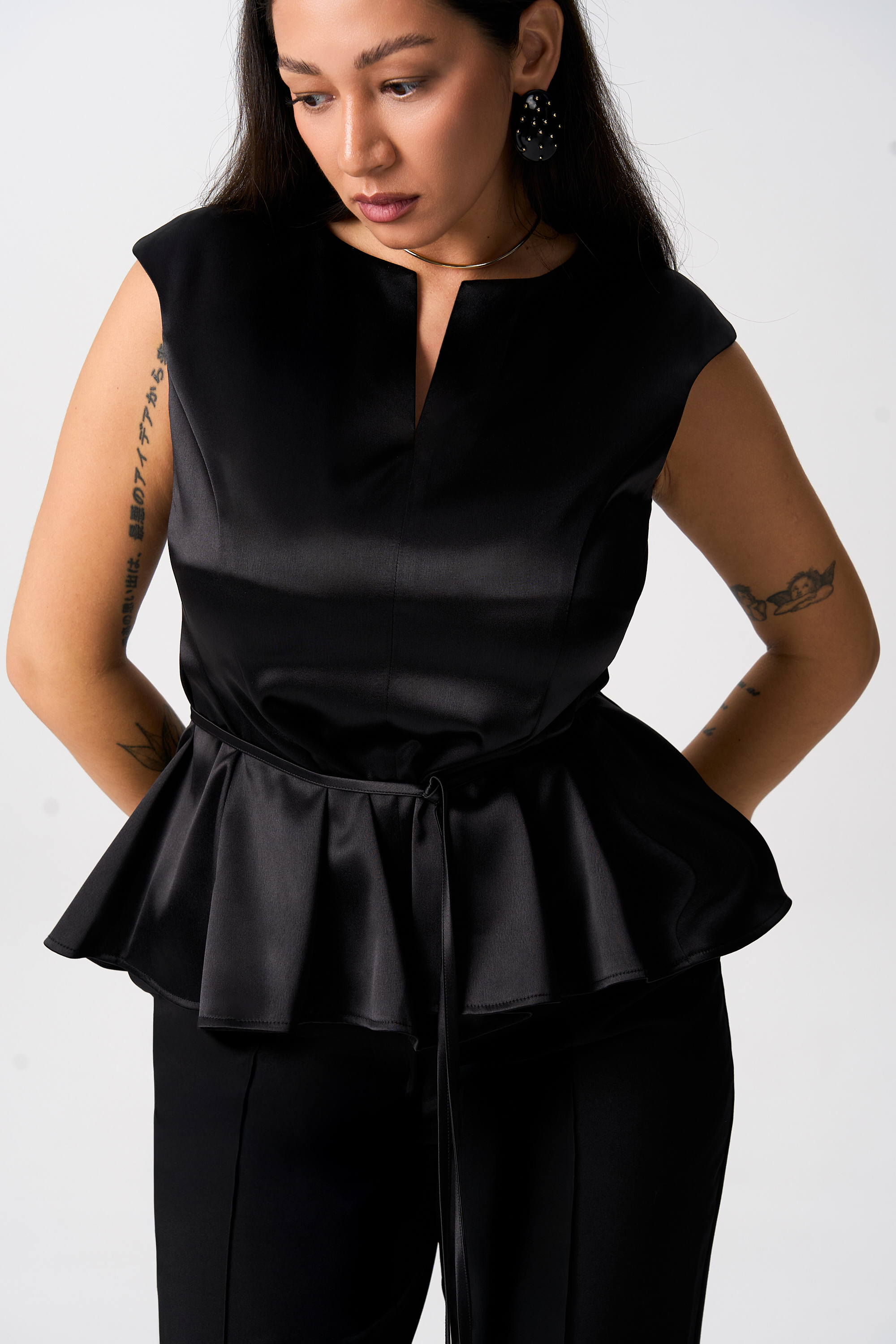 Модель полуприлегающего силуэта. По переду рельефы,переходящие в баску Горловина с V-вырезом. Рукав слегка спущенный. В комплекте тонкий пояс из основного материала.
