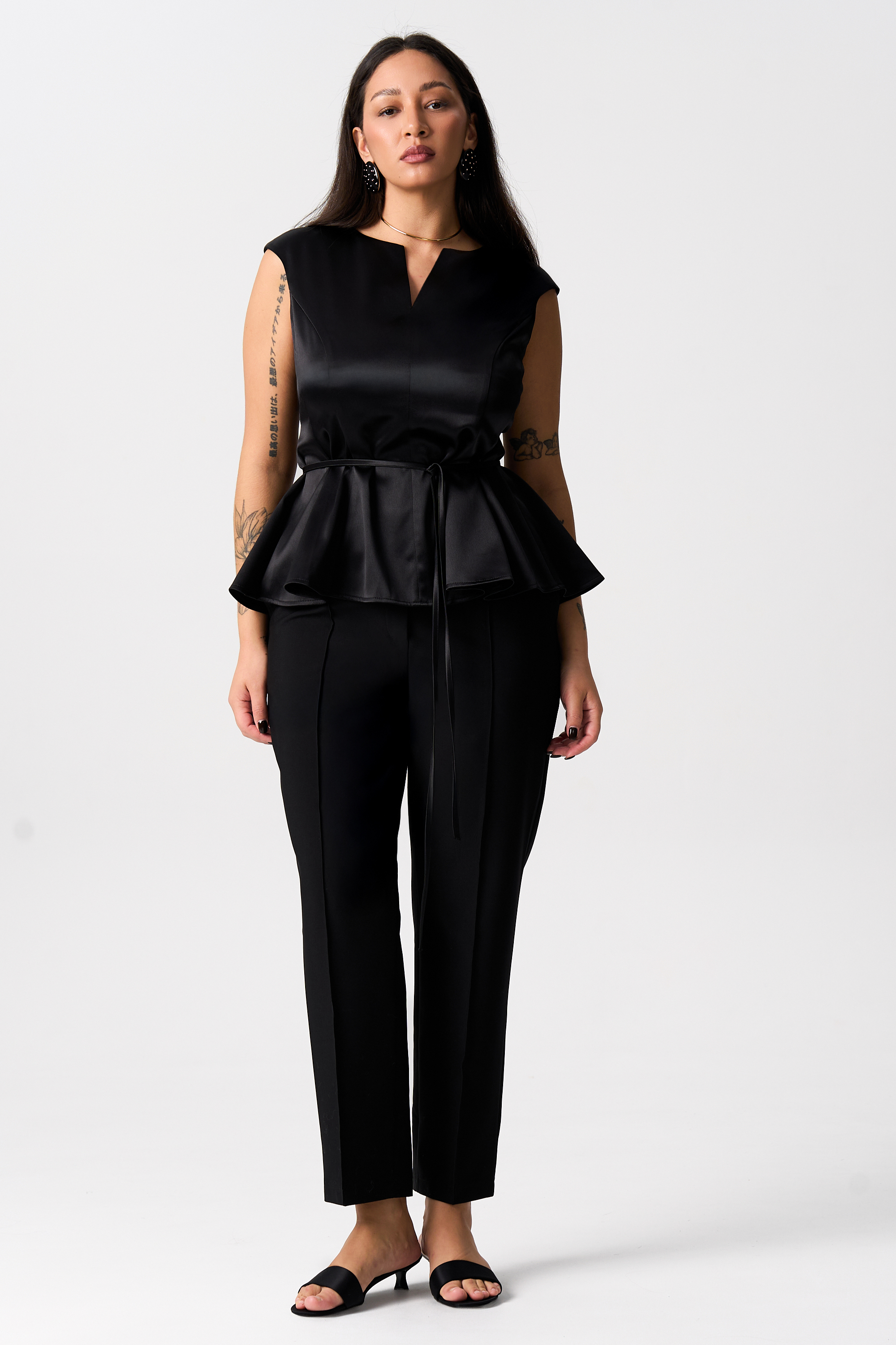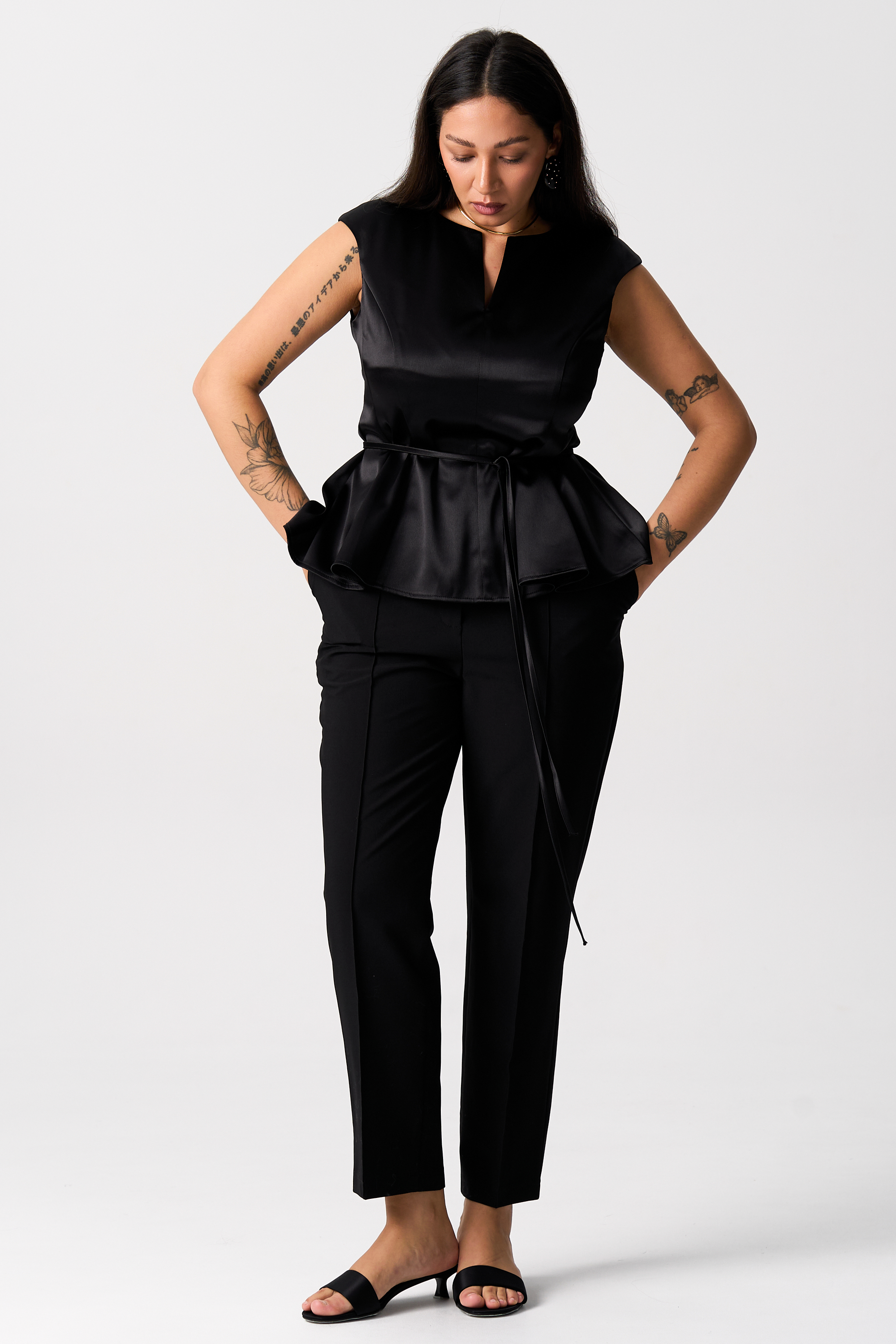 Модель прилегающего силуэта с карманами и застроченными стрелками. На поясе резинка для лучшей посадки.