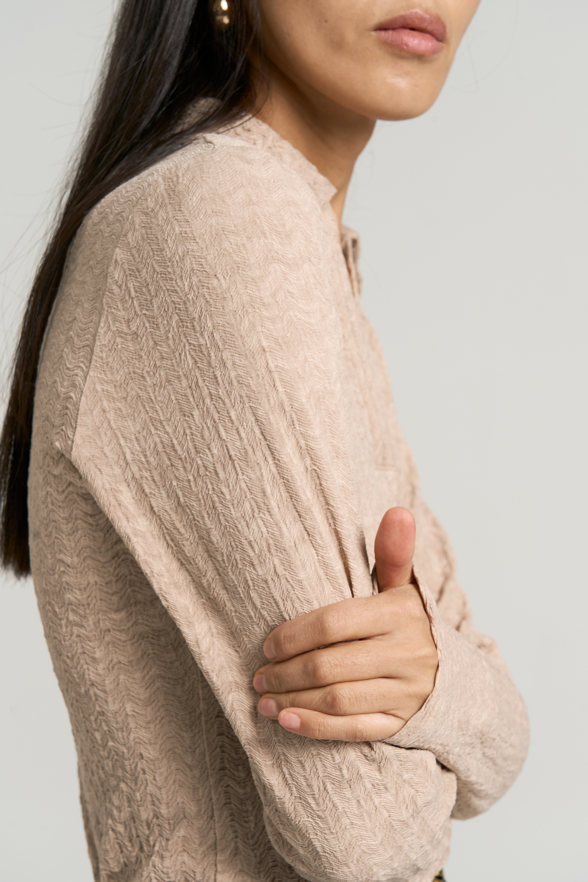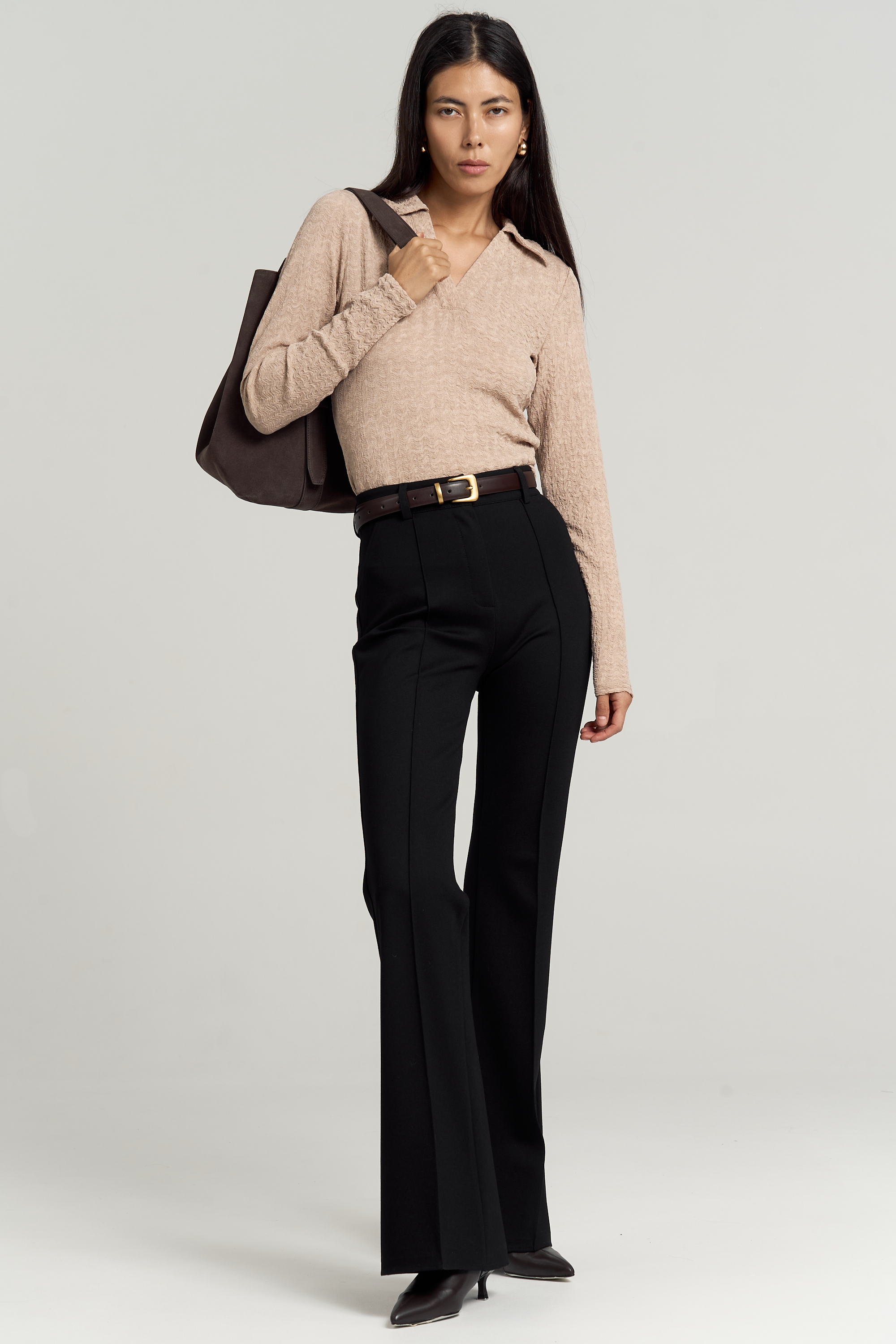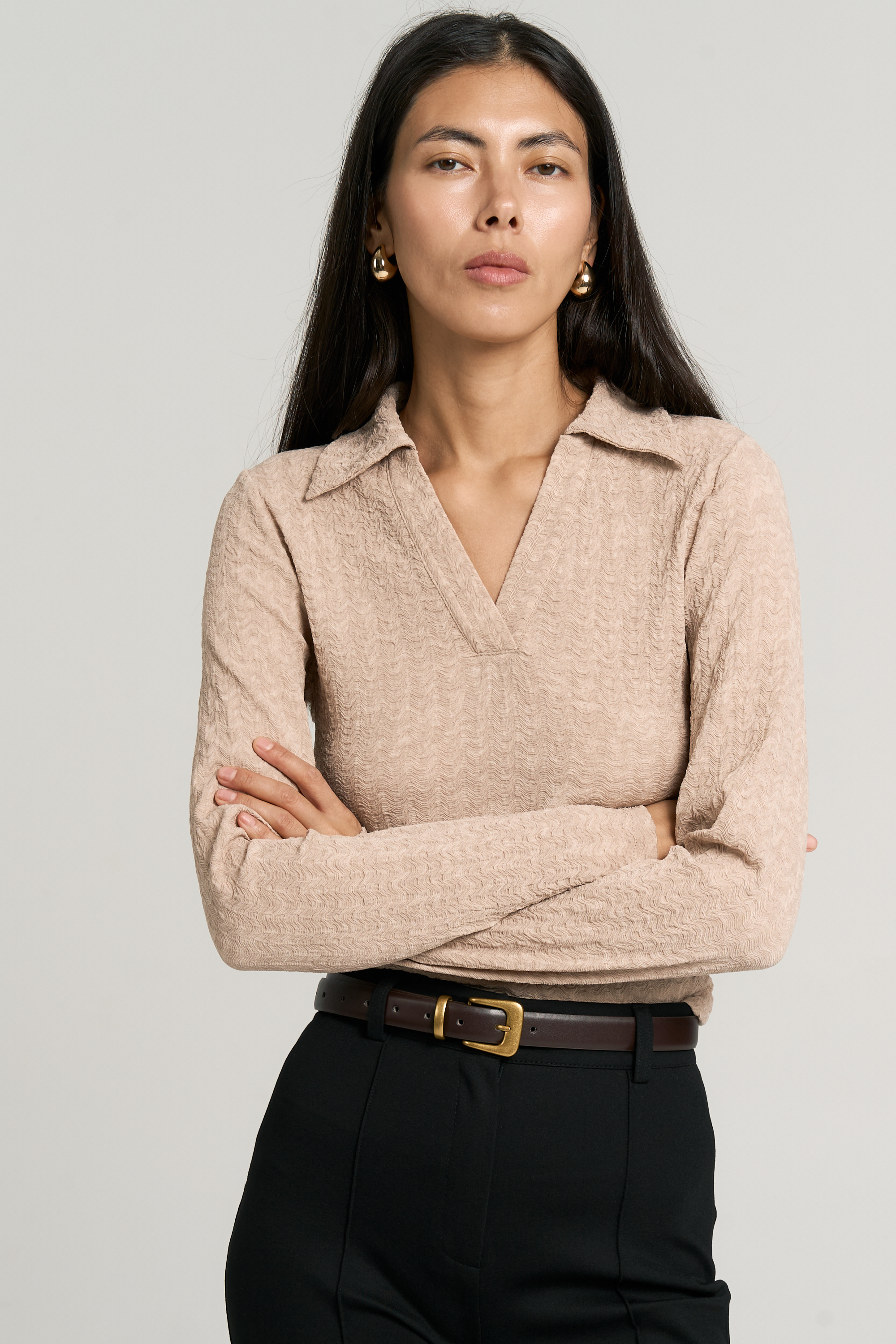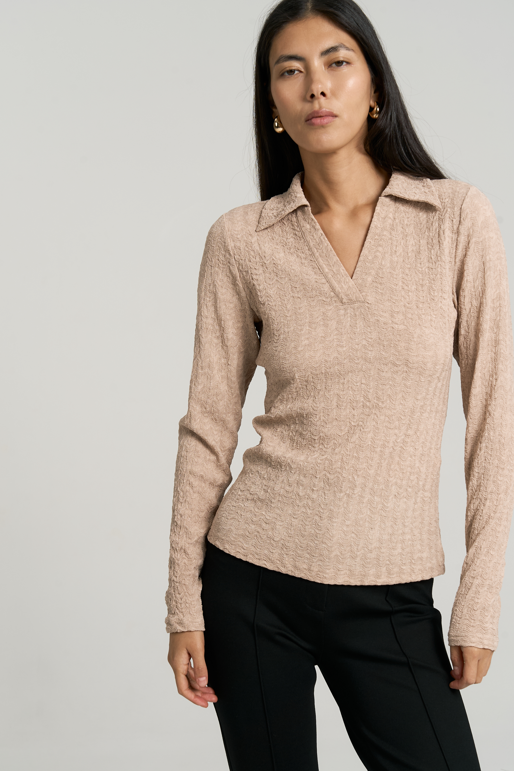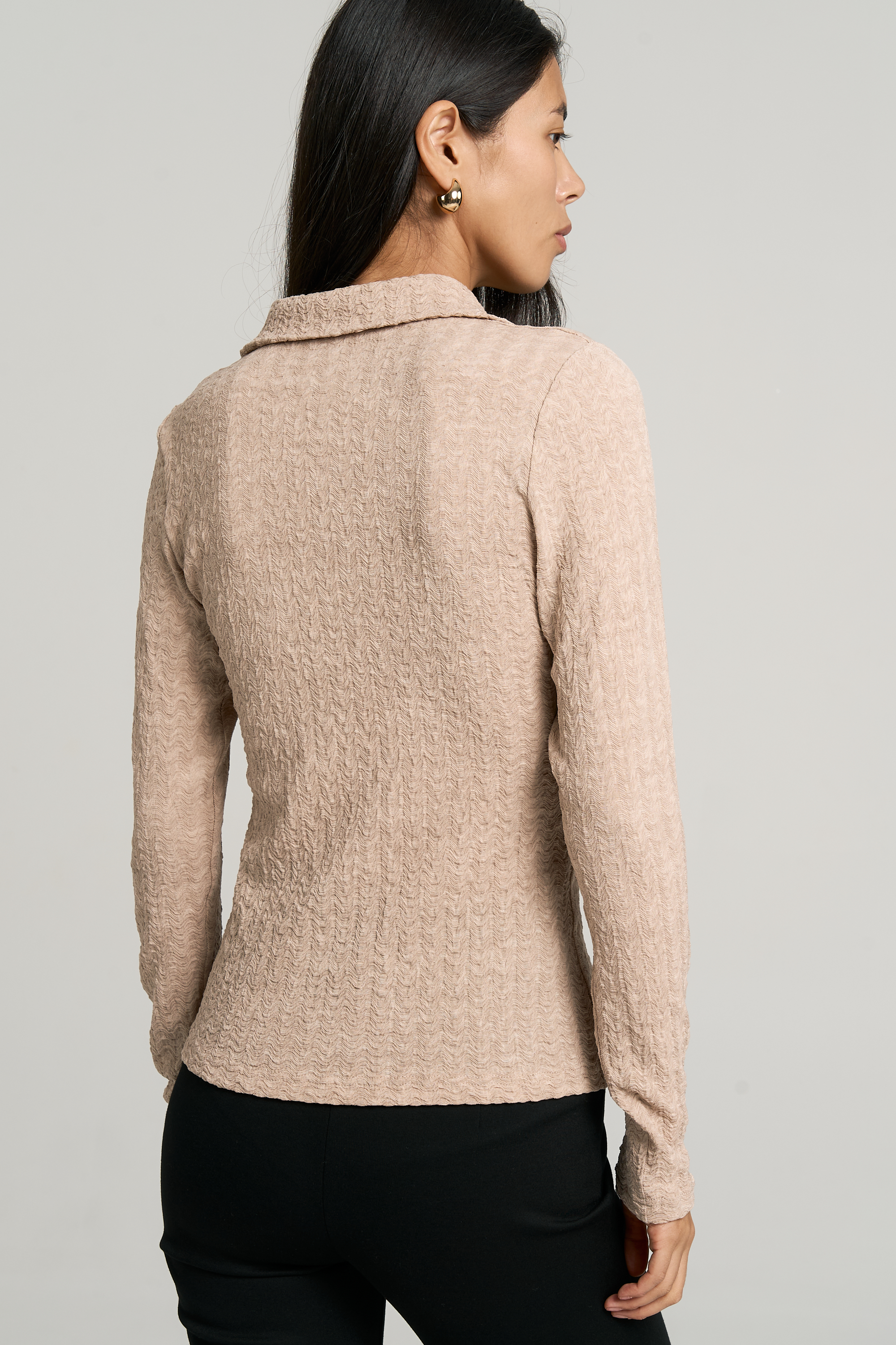 Модель полуприлегающего силуэта. Вырез оформлен воротником-поло. Рукав втачной.